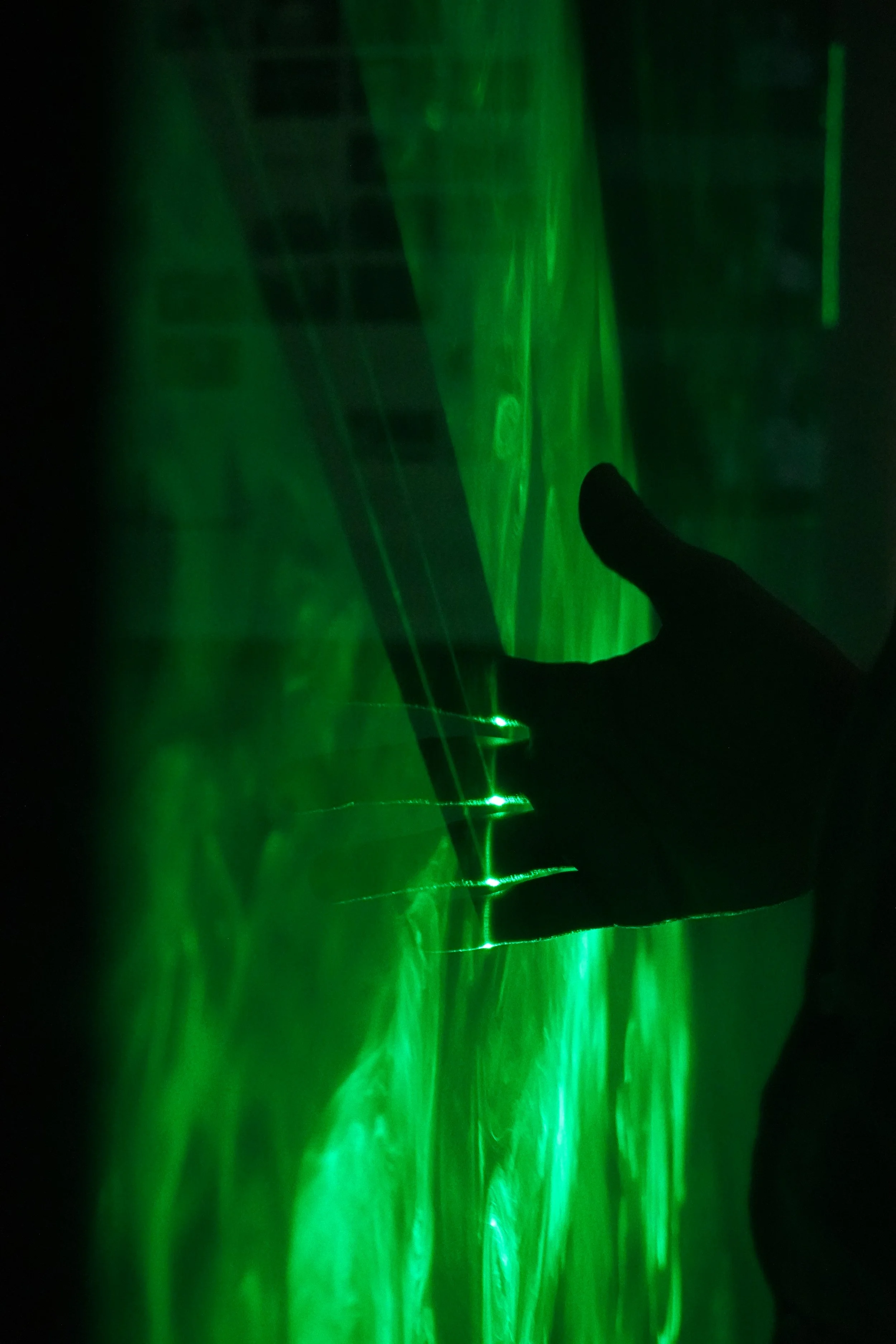 an installation using a laser beam’s interaction with dust and smoke in the air to create a temporary surface which one can pass through. with the flowing wind, it dynamically appears and disappears creating an invisible-visible border to transverse through.
