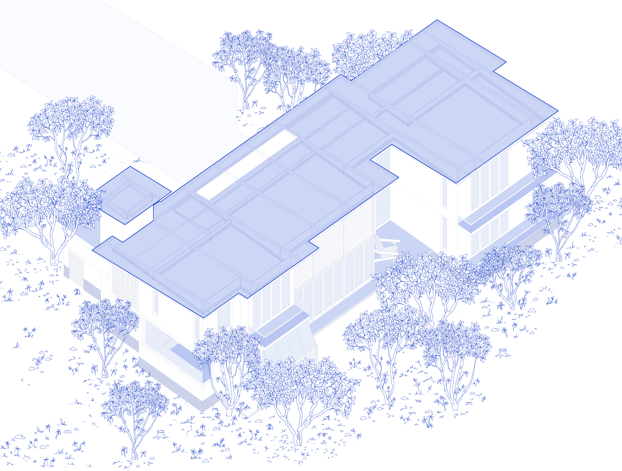 a cozy home nestled within a dense chikoo plantation, seeking a quiet sense of harmony. a conscious decision was made to disturb the existing trees as little as possible; resulting in a compact footprint placed gently among them.