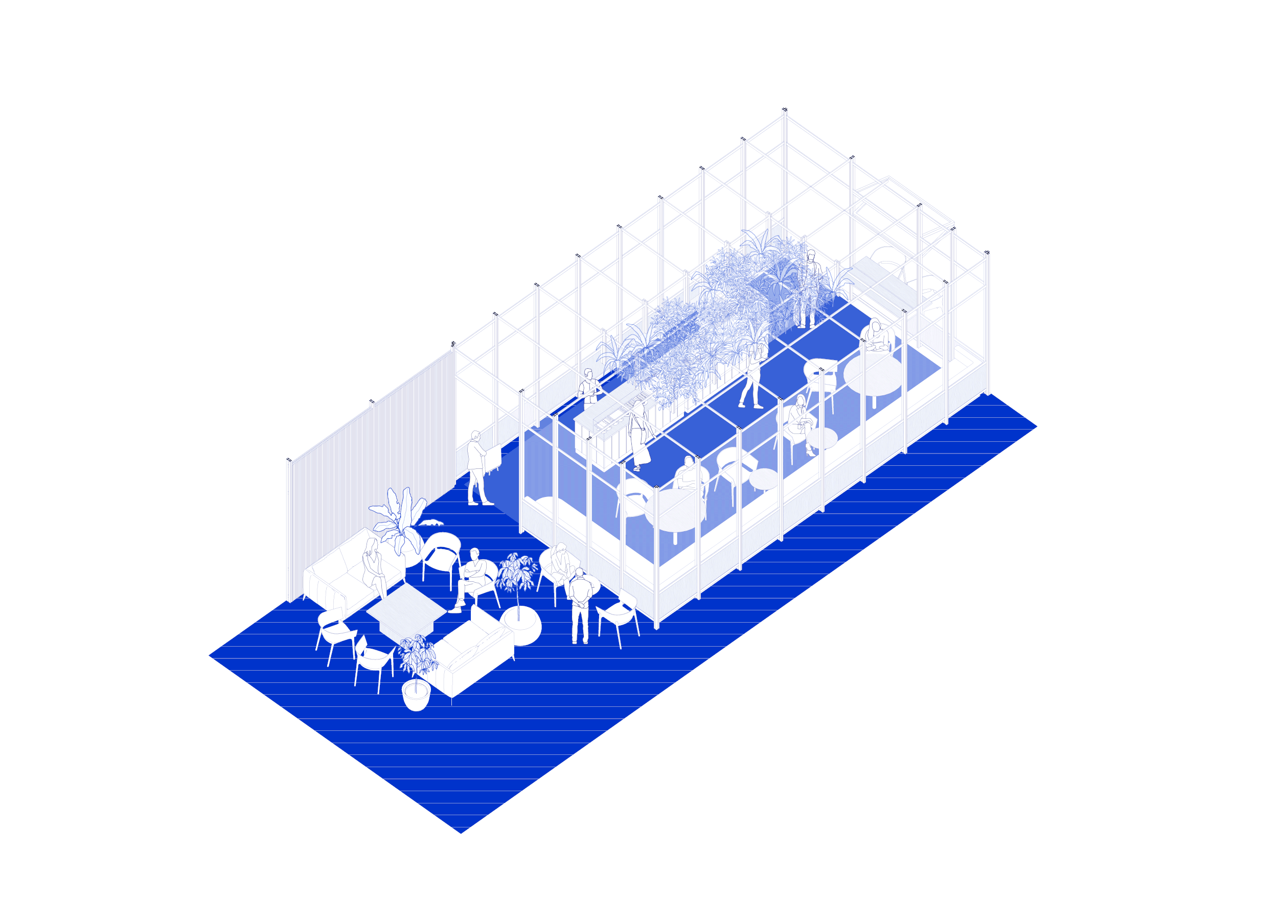 a pop-up cafe situated at the heart of a corporate office—designed for speed, simplicity, and precision. the structure was prefabricated for ease of assembly and made to be self supporting eliminating the need for any structural anchors.